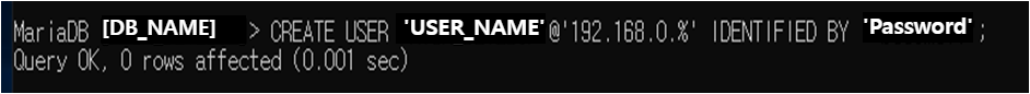 >> CREATE USER ‘[USER_NAME]‘@’[호스트]’ IDENTIFIED BY ‘[PASSWORD]’;