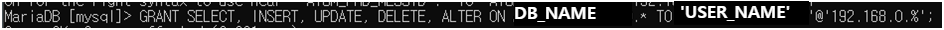 >>일반사용자) GRANT SELECT, INSERT, UPDATE, DELETE, ALTER ON `[DB_NAME]`.* TO `[USER_NAME]`@`[호스트]`;