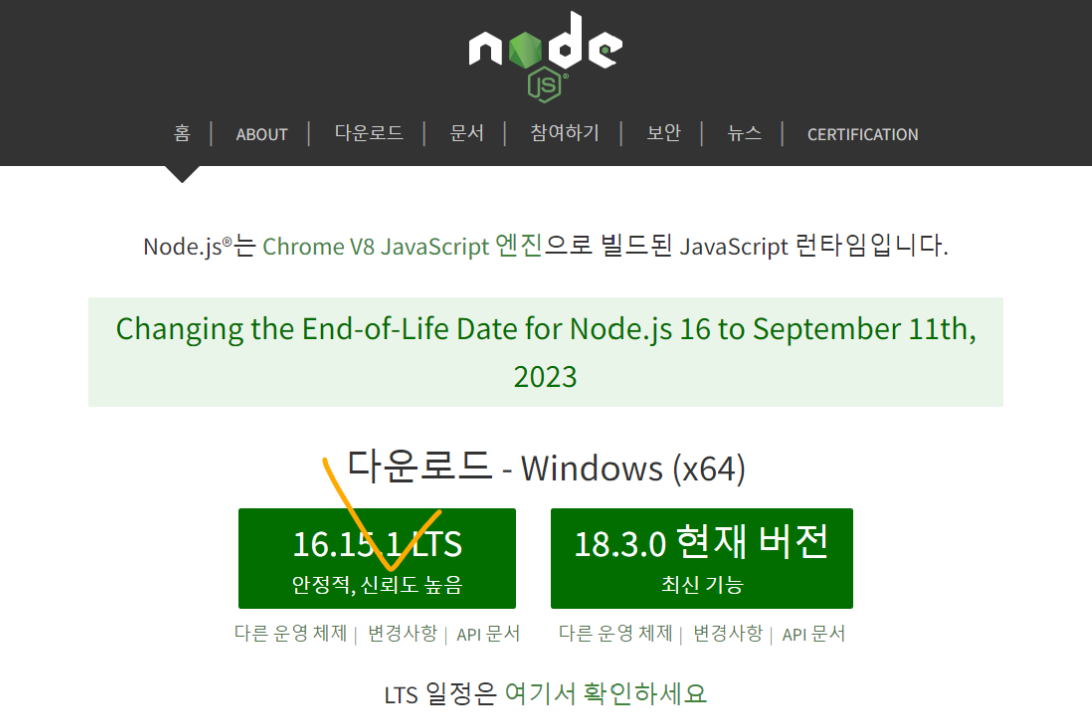 cmd창에서 node -v 입력, 버전이 나오면 설치되어 있는 것