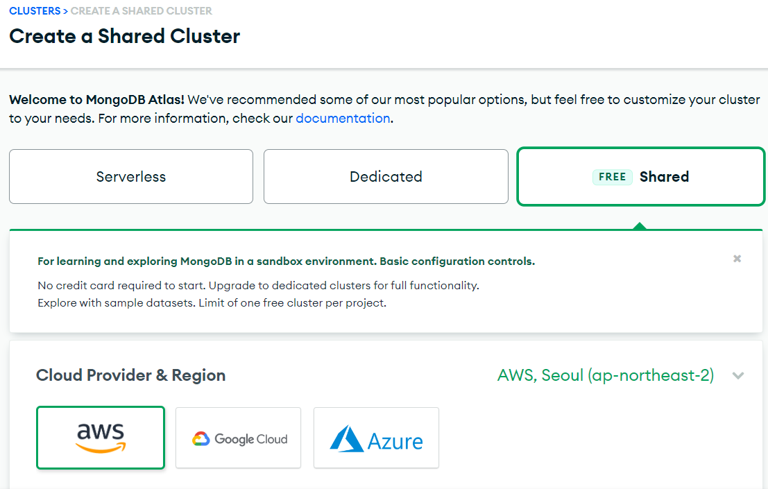 1-1. Cloud상에 몽고 DB를 생성하는 것, Cloud 서비스 제공하는 곳 3가지 중 아무거나 선택해도 상관x