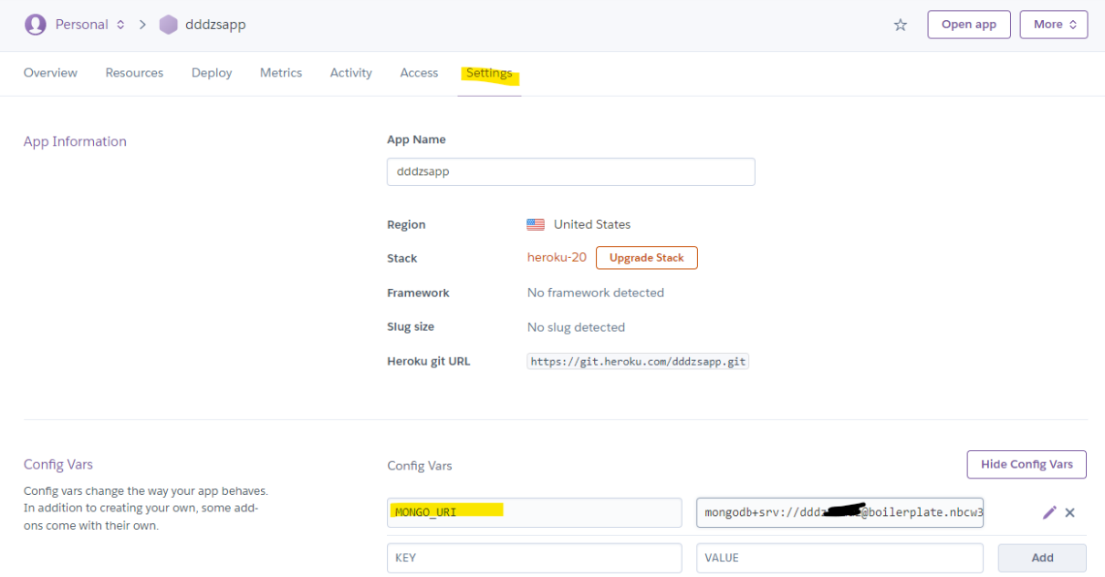 2-2-3. setting 텝에서 config vars 추가
