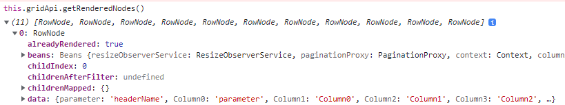 agGrid 모든 데이터 가져오기 agGrid에는 전체 데이터를 가져오는 옵션이 없어서 전체 노드를 가져온 후 for문으로 데이터를 추출해야합니다. 1. forEachNode getAllRows() { let rowData = []; this.gridApi.forEachNode(node => rowData.push(node.data)); return rowData; } 2. getRenderNodes this.gridApi.getRenderedNodes() 카테고리 없음 2023.04.10